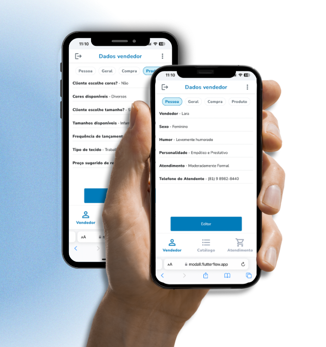 “Enquanto estou cuidando das outras coisas da minha empresa, a Mi, minha vendedora criada pelo Modall para Miben atende meus clientes tirando todas as dúvidas. Os clientes até agradecem a atenção que ela dá.”